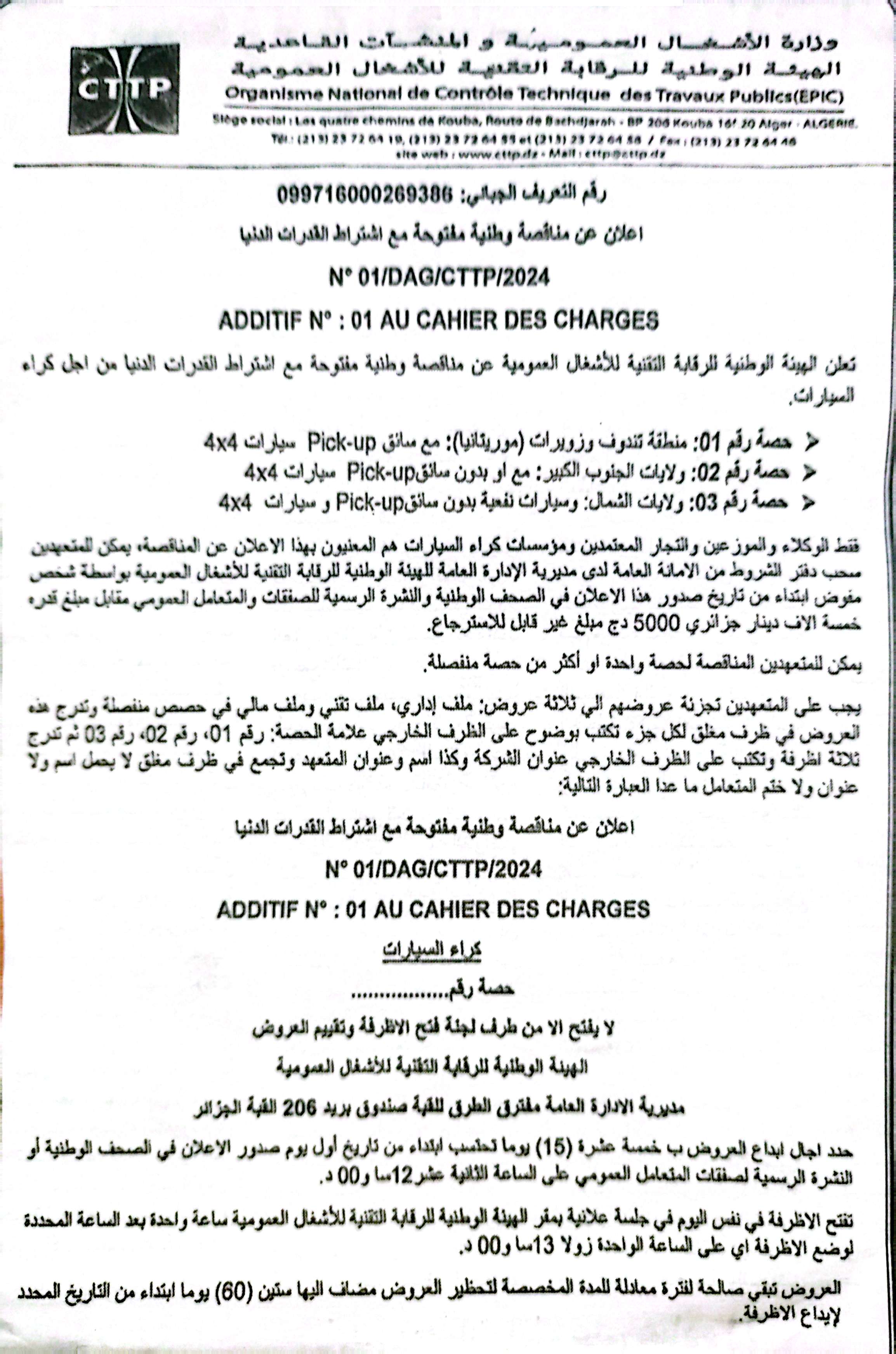 L'ogranisme National de Contrôle Technique des travaux Public "CTTP" lance un avis d'appel d'offre national avec exigence de capacité minimale N°: 01/DAG/CTTP/2024 additif n°1 au cahier des charges pour la location de véhicules: